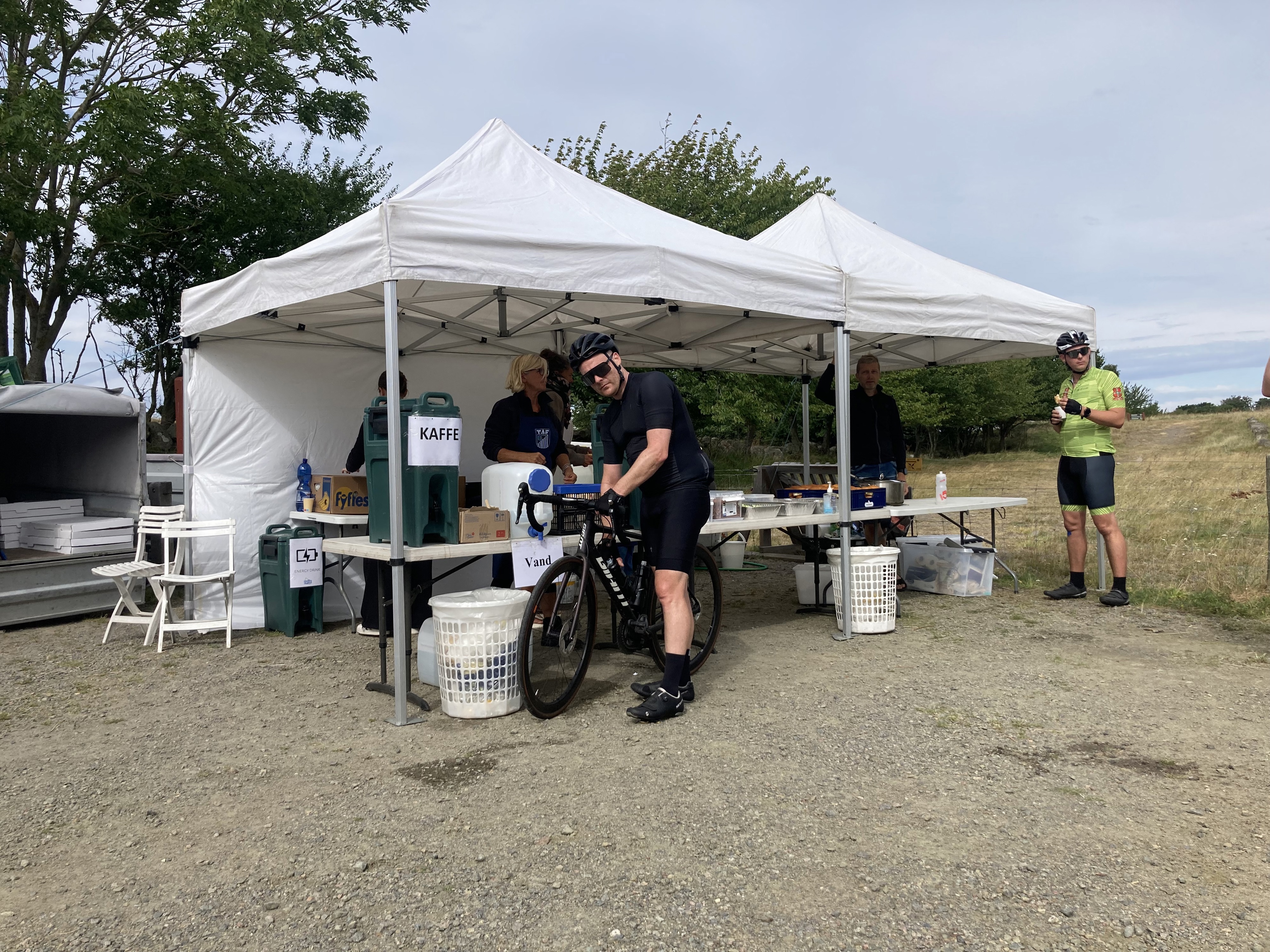 Vi tilbyder dig væske (vand) og energidrik. Der er saltstænger, lidt sødt og frugt (bananer, appelsiner), agurk, citroner, slik - alt efter hvilket af depoterne du kommer til. De er lidt forskellige.